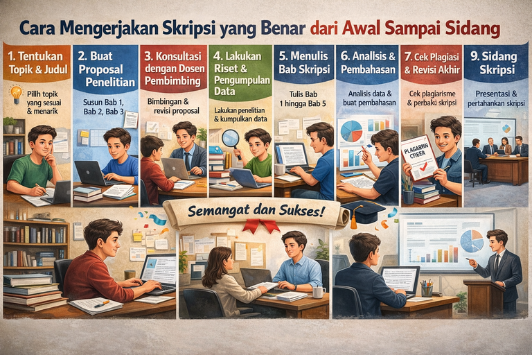 Cara Mengerjakan Skripsi yang Benar dari Awal Sampai Sidang Cara mengerjakan skripsi sering menjadi tantangan terbesar bagi mahasiswa tingkat akhir. Banyak mahasiswa merasa bingung harus mulai dari mana, bagaimana menyusun penelitian, hingga cara menghadapi dosen pembimbing. Akibatnya, tidak sedikit yang mengalami keterlambatan lulus. Padahal, jika kamu memahami cara mengerjakan skripsi yang benar sejak awal, prosesnya bisa menjadi lebih mudah dan terarah. Oleh karena itu, artikel ini akan membahas langkah-langkah lengkap dari awal hingga sidang agar kamu bisa menyelesaikan skripsi dengan lebih cepat dan efektif. Pengertian Skripsi dan Tujuannya Skripsi merupakan karya ilmiah yang wajib disusun oleh mahasiswa sebagai syarat kelulusan. Melalui skripsi, mahasiswa menunjukkan kemampuan dalam melakukan penelitian, menganalisis data, serta menyusun laporan secara sistematis. Selain itu, skripsi juga bertujuan untuk melatih kemampuan berpikir kritis dan problem solving. Oleh sebab itu, penting bagi mahasiswa untuk memahami proses penyusunannya dengan baik. Persiapan Sebelum Mengerjakan Skripsi Sebelum mulai menulis, kamu perlu melakukan beberapa persiapan penting. Langkah ini akan sangat membantu mempercepat proses pengerjaan skripsi. 1. Menentukan Topik Penelitian Pilih topik yang sesuai dengan minat dan kemampuan kamu. Selain itu, pastikan topik tersebut memiliki referensi yang cukup agar memudahkan proses penelitian. 2. Mencari Referensi Kumpulkan jurnal, buku, dan sumber terpercaya lainnya. Dengan referensi yang kuat, kamu akan lebih mudah menyusun landasan teori. 3. Menentukan Judul yang Tepat Judul harus jelas, spesifik, dan menggambarkan isi penelitian. Hindari judul yang terlalu luas karena akan menyulitkan saat analisis. 4. Konsultasi dengan Dosen Pembimbing Diskusikan ide kamu sejak awal. Dengan begitu, kamu bisa mendapatkan arahan yang tepat dan menghindari revisi besar di kemudian hari. Langkah-Langkah Mengerjakan Skripsi Setelah persiapan matang, kamu bisa mulai masuk ke tahap pengerjaan. Berikut langkah-langkah yang perlu kamu lakukan. 1. Menyusun Proposal Skripsi Proposal berisi latar belakang, rumusan masalah, tujuan penelitian, serta metode yang digunakan. Pastikan proposal kamu tersusun dengan sistematis agar mudah dipahami. 2. Melakukan Penelitian Kumpulkan data sesuai dengan metode yang telah kamu tentukan. Misalnya, kamu bisa menggunakan metode kualitatif atau kuantitatif. 3. Mengolah dan Menganalisis Data Setelah data terkumpul, lakukan analisis secara tepat. Gunakan software seperti SPSS atau Excel jika diperlukan. 4. Menyusun Bab per Bab Tulis skripsi secara bertahap mulai dari Bab 1 hingga Bab 5. Fokus pada satu bagian agar hasilnya lebih maksimal. 5. Revisi dan Konsultasi Setelah menulis, segera konsultasikan dengan dosen pembimbing. Lakukan revisi dengan cepat agar proses tidak terhambat. Tips Agar Skripsi Cepat Selesai Agar proses pengerjaan skripsi berjalan lancar, kamu perlu menerapkan beberapa strategi berikut. Buat jadwal harian agar lebih disiplin Kerjakan sedikit demi sedikit setiap hari Hindari menunda pekerjaan Aktif konsultasi dengan dosen Cari lingkungan yang mendukung Selain itu, kamu juga bisa bergabung dengan teman yang sedang mengerjakan skripsi. Dengan begitu, kamu bisa saling memotivasi. Kesalahan yang Harus Dihindari Saat Skripsi Banyak mahasiswa melakukan kesalahan yang sebenarnya bisa dihindari. Berikut beberapa di antaranya. 1. Menunda Pengerjaan Kebiasaan menunda hanya akan membuat skripsi semakin sulit diselesaikan. Oleh karena itu, mulailah dari sekarang. 2. Jarang Konsultasi Jika kamu jarang berkonsultasi, risiko revisi besar akan semakin tinggi. Maka dari itu, rutinlah berkomunikasi dengan dosen pembimbing. 3. Tidak Mengikuti Pedoman Setiap kampus memiliki aturan penulisan. Pastikan kamu mengikuti pedoman tersebut agar tidak perlu revisi berulang. 4. Plagiarisme Hindari menyalin karya orang lain tanpa mencantumkan sumber. Gunakan tools plagiarism checker untuk memastikan keaslian tulisan. Persiapan Menghadapi Sidang Skripsi Setelah skripsi selesai, kamu perlu mempersiapkan diri untuk sidang. Tahap ini sangat penting karena menentukan kelulusan kamu. 1. Memahami Isi Skripsi Pelajari kembali seluruh isi skripsi kamu. Pastikan kamu memahami setiap bagian dengan baik. 2. Menyiapkan Slide Presentasi Buat slide yang ringkas dan jelas. Fokus pada poin-poin penting agar mudah dipahami oleh penguji. 3. Latihan Presentasi Latih cara penyampaian kamu agar lebih percaya diri. Selain itu, latihan juga membantu mengurangi rasa gugup. 4. Siapkan Jawaban untuk Pertanyaan Biasanya, dosen akan mengajukan pertanyaan terkait penelitian kamu. Oleh karena itu, siapkan jawaban yang logis dan jelas. Kesimpulan Cara mengerjakan skripsi yang benar dimulai dari persiapan yang matang, proses pengerjaan yang terstruktur, hingga persiapan menghadapi sidang. Dengan mengikuti langkah-langkah di atas, kamu bisa menyelesaikan skripsi dengan lebih mudah dan tepat waktu. Selain itu, kunci utama keberhasilan terletak pada konsistensi dan disiplin. Jika kamu mampu mengatur waktu dengan baik dan rutin berkonsultasi, skripsi bukan lagi menjadi hal yang menakutkan. Mulailah sekarang, dan buktikan bahwa kamu bisa lulus tepat waktu!